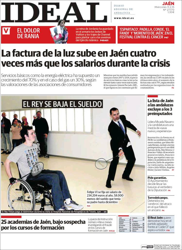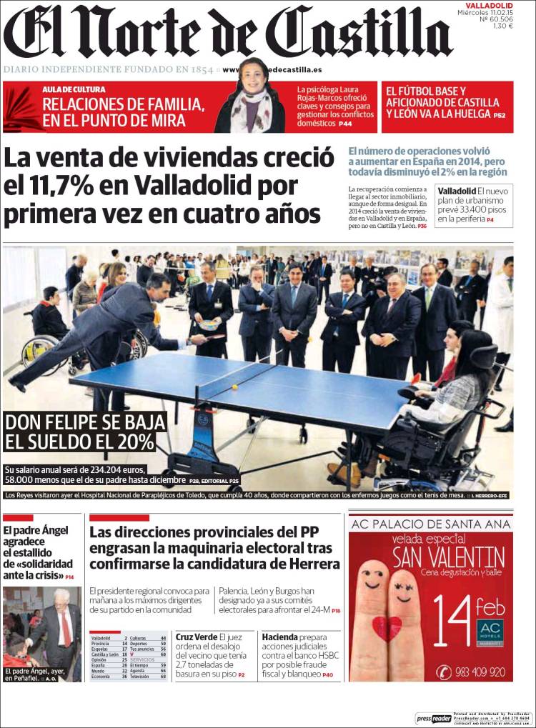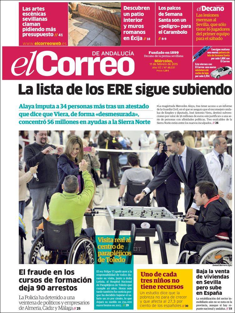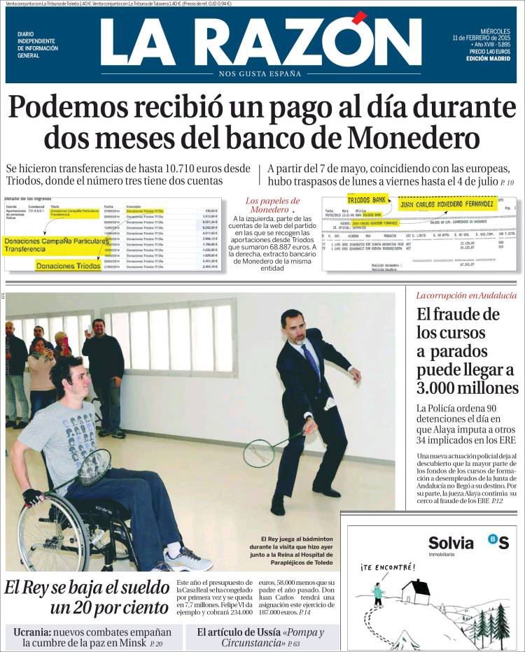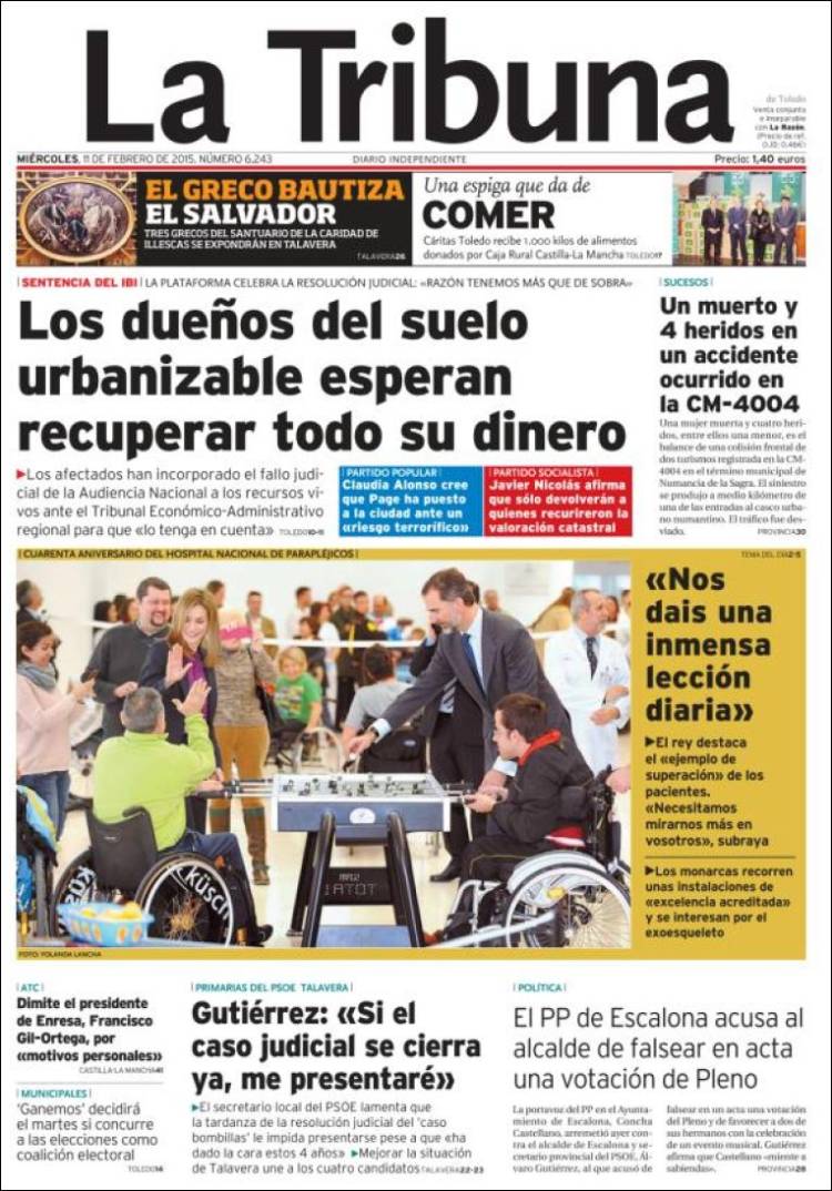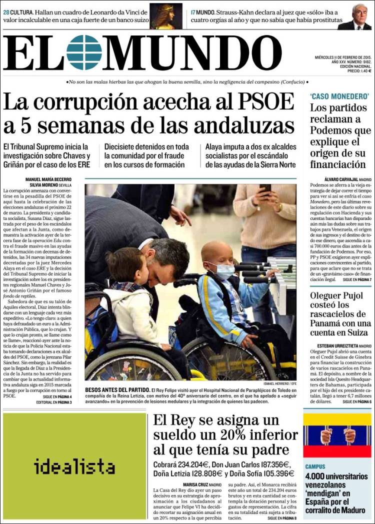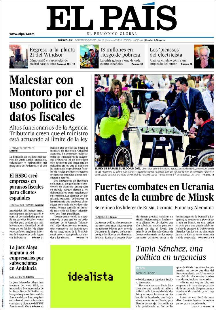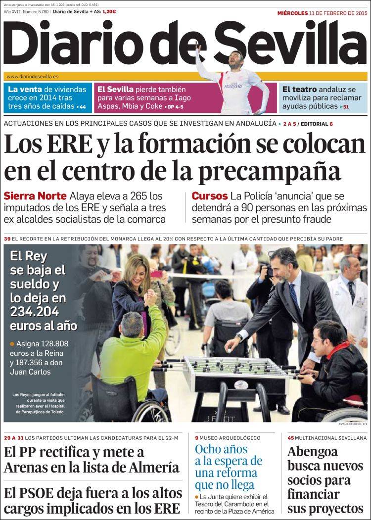 Traigo este tema hoy al blog por una razón bien sencilla. ¿Habéis hojeado esta mañana la prensa? Cerca de una decena de periódicos, cuatro nacionales (El País, El Mundo, La Razón) y seis regionales (Correo de Andalucía, Diario de Sevilla, Ideal de Jaén, Granada Hoy, El Norte de Castilla y La Tribuna de Toledo) llevan a sus portadas el anuncio de la bajada del sueldo del Rey, acompañado de fotografías de su visita, junto a la Reina Letizia, al Hospital de Parapléjicos de Toledo.